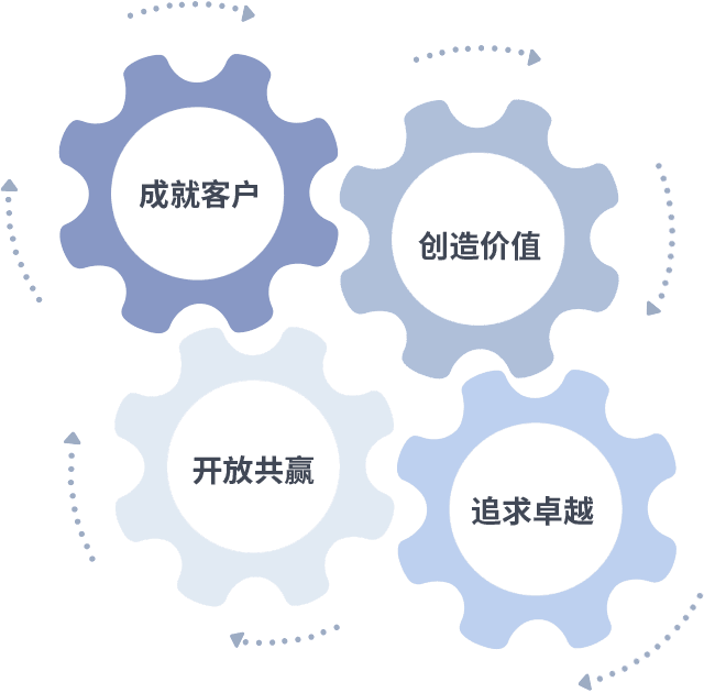 成就客户是一切决策的出发点,,,创造价值是衡量所有工作的标准,,追求卓越是我们做事做人的态度,,,,开放共赢是我们的格局也是最终的结果。。价值观的齿轮环环相扣,,,推动着组织里的每个人不断向前。。
